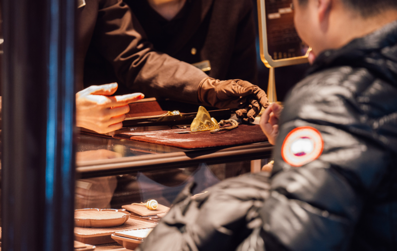 无痕嵌丝工艺更是将精细推向极致。高级匠师需在40倍显微镜下凝神操作,将细金花丝精准嵌入作品凹槽,通过激光点焊与反复打磨,实现视觉无痕、触感顺滑的完美效果。匠心錾刻则强调“刀随形走,一气呵成”,匠师凭借手腕的灵巧与力量的精准,在方寸之间捕捉图案的神韵,确保每一件作品都具备完整的艺术画面。高珠级镶嵌工艺以高级珠宝的标准设计爪位,由匠人在显微镜下手工修整并抛光,既增强了镶嵌的稳固性,又使金爪圆润美观。而镜砂工艺则通过从400目到1200目砂纸的多次打磨,结合极细镜面喷砂,创新呈现出“镜中有砂,触中有油”的君佩皇家金色,提升了佩戴的视觉美感与舒适体验。