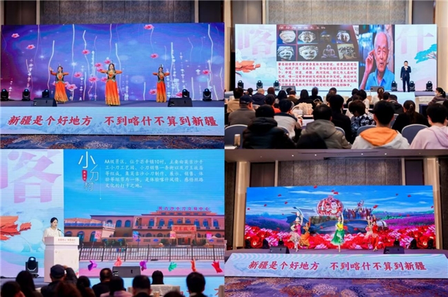 活动在热情洋溢的木卡姆选段《我的爱献给祖国母亲》中拉开帷幕。喀什地区文旅推介官李江江、疏勒县推介官崔佳莉、英吉沙县推介官赵雅萍、岳普湖县推介官迪丽热巴·麦麦提艾力依次登台,通过图文影音、生动讲解,全面展现了喀什冬季的壮美风光、民俗风情和非遗文化。活动中穿插的《顶碗舞》《双人舞》《多彩喀什》等精彩表演,更让现场观众仿佛置身于喀什的歌舞之乡。
